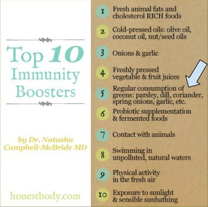 We have explored 1 through 4 of the Top 10 Immunity Boosters, from the GAPS Diet by Dr. Natasha Campbell-McBride. Today we’re going to talk about #5 – How to boost immunity with greens. For previous posts in this series, click here.